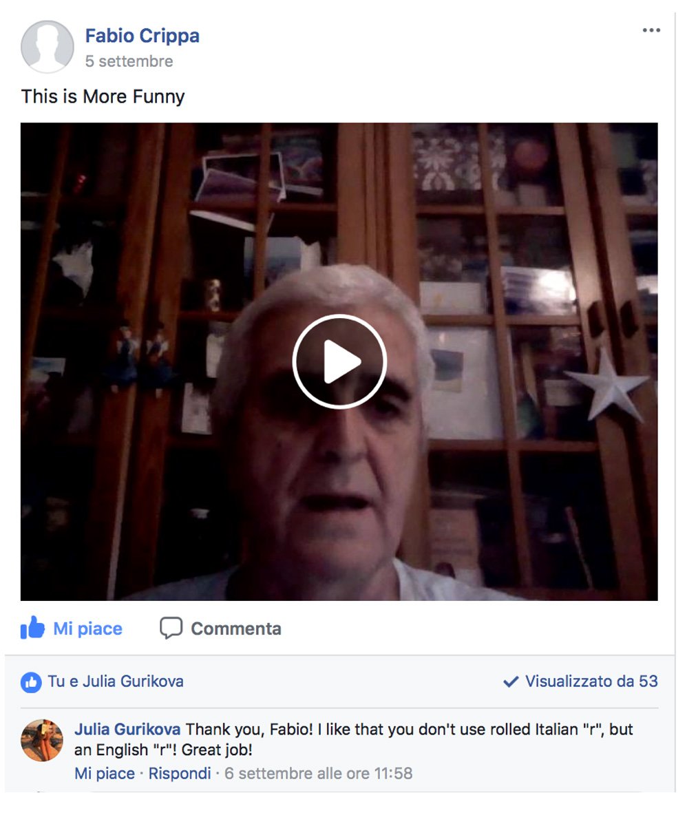 Inizio ad essere presente anche sulla pagina facebook del corso, per via degli esercizi. Anche in questo caso, sono colpito da un fatto positivo: tutte le interazioni che mi capita di avere con le persone di IngleseFast avvengono all’insegna di un rapporto quanto mai amichevole e confortevole, i feedback che ricevo sui miei esercizi, anche quando evidenziano errori palesi, sono sempre formulati in modi positivi.