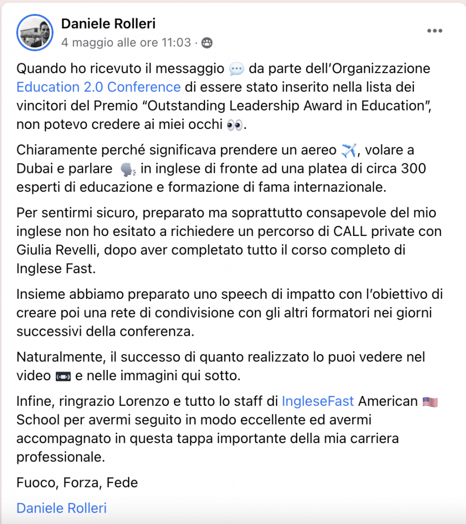 Io mi sono iscritto perché ho bisogno dell’inglese nel mio lavoro. In particolare dovevo preparare uno speech su metodologia di vendita, con terminologia specifica e molto difficile, di fronte a circa 500 persone. È andata benissimo, mi hanno fatto tutti i complimenti. Io poi sono una persona molto critica, ho ascoltato la registrazione e ho notato i miei errori per ripartire con un processo per migliorare di più il livello.